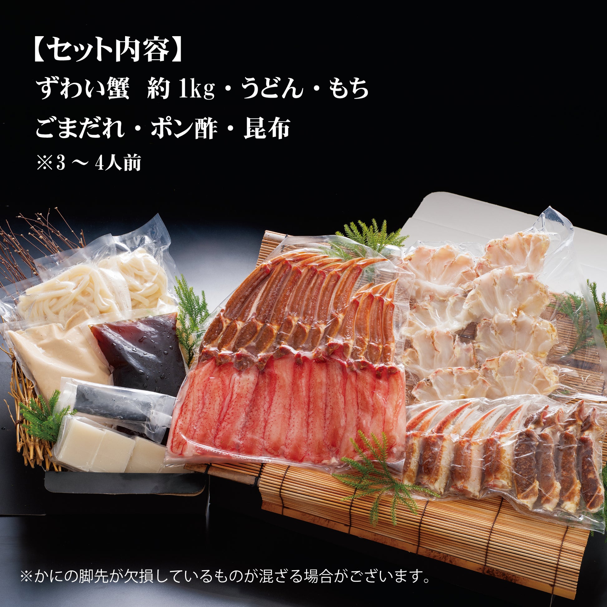 オオズワイガニ1100g、冷凍うどん4カット、お餅2個(カット可能)、出汁用昆布1枚、特製胡麻たれ、特製ポン酢。